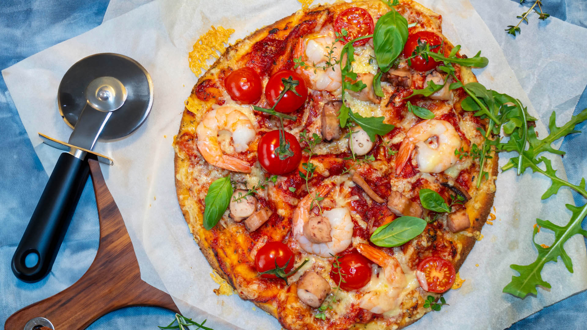 - Take pizzas out of the oven, spread the hot pizza bases evenly with the squid, prawns and tomatoes, season generously and scatter with cheese and thyme leaves.