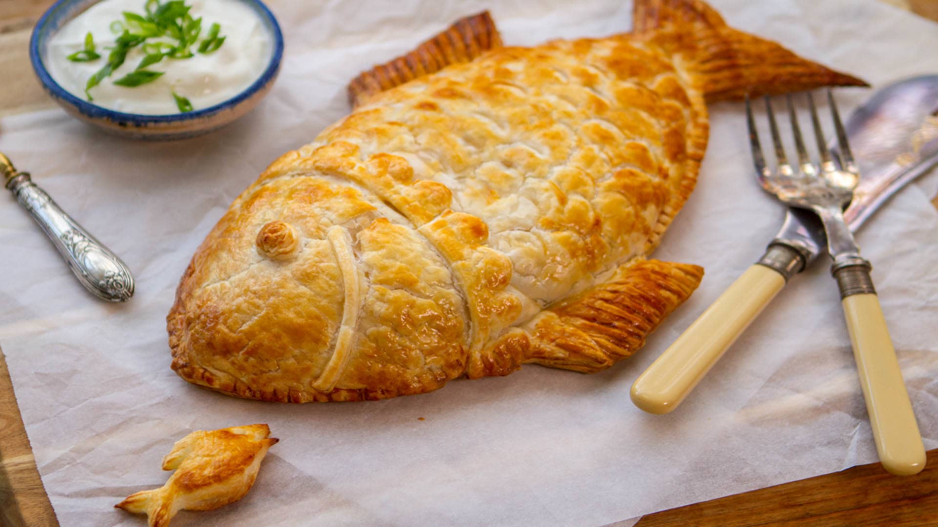- Use pastry off cuts to make gills, an eye and a smiley fish mouth. Brush again with egg.