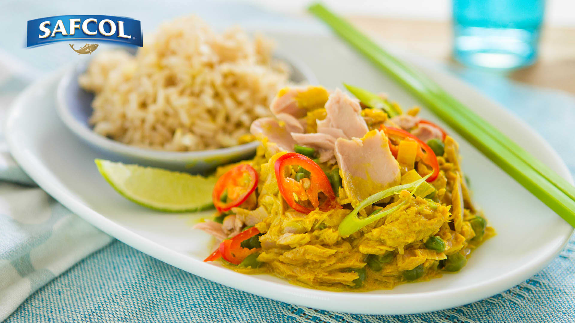 - Fold through flaked Safcol tuna and peas. Check the curry for seasoning and adjust to your taste.