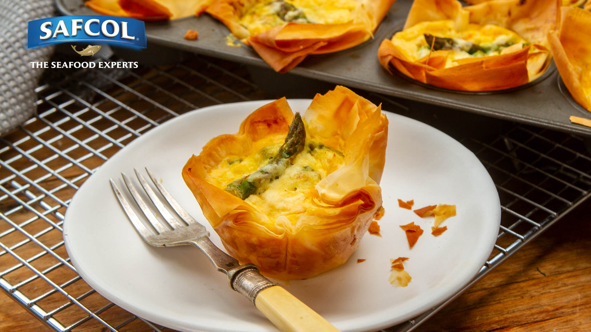 - Divide the salmon flakes and asparagus between the 12 pastry lined patty pans.