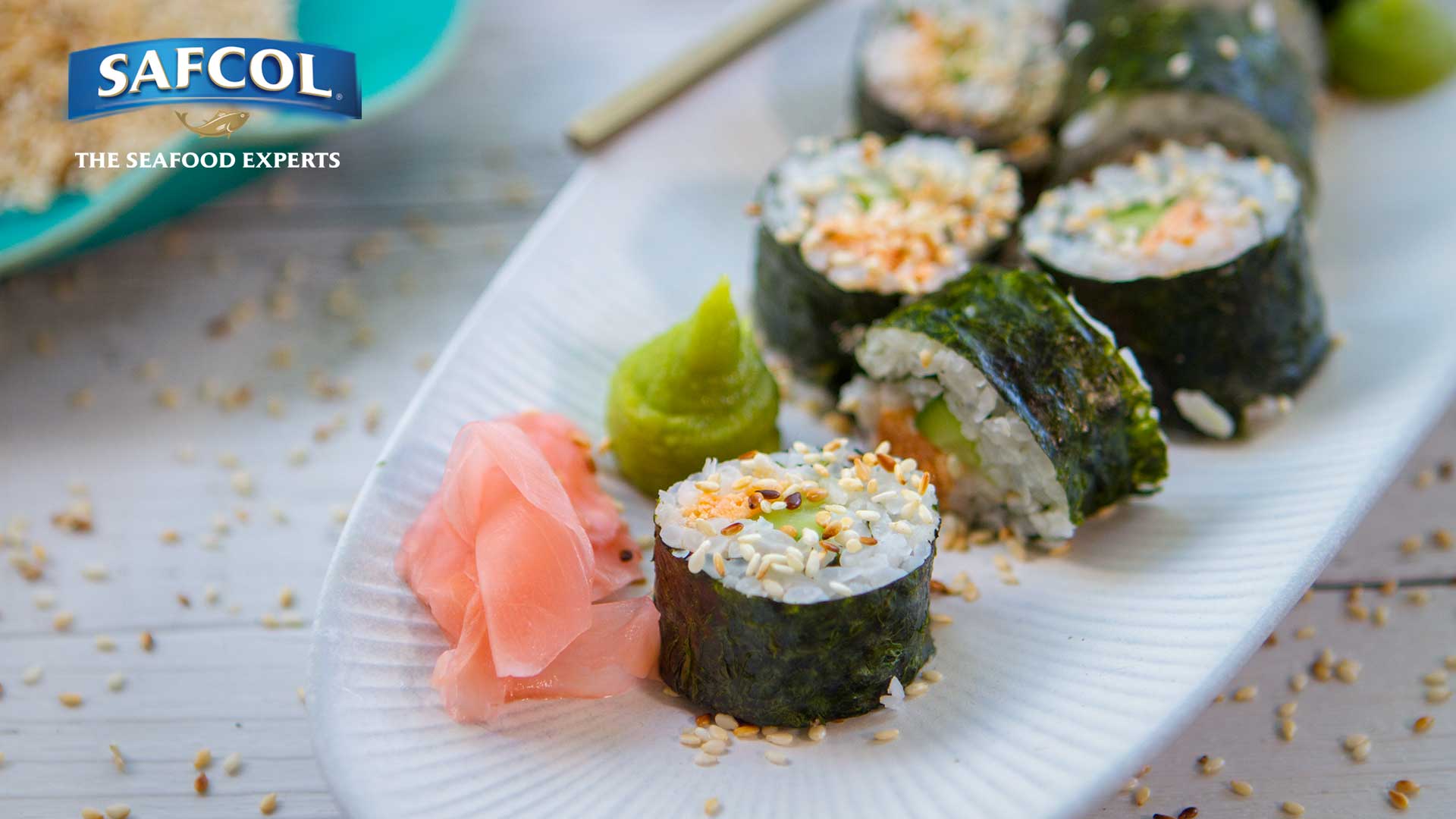 - Arrange strips of the cucumber and carrot across the middle of the sushi rice and add thin wipe of wasabi if you like it. Lay a thin line of salmon flakes on top of the vegetables. Wet the bare end of the nori and using the mat, lift the end of the nori closest to you and roll it into a tight log.