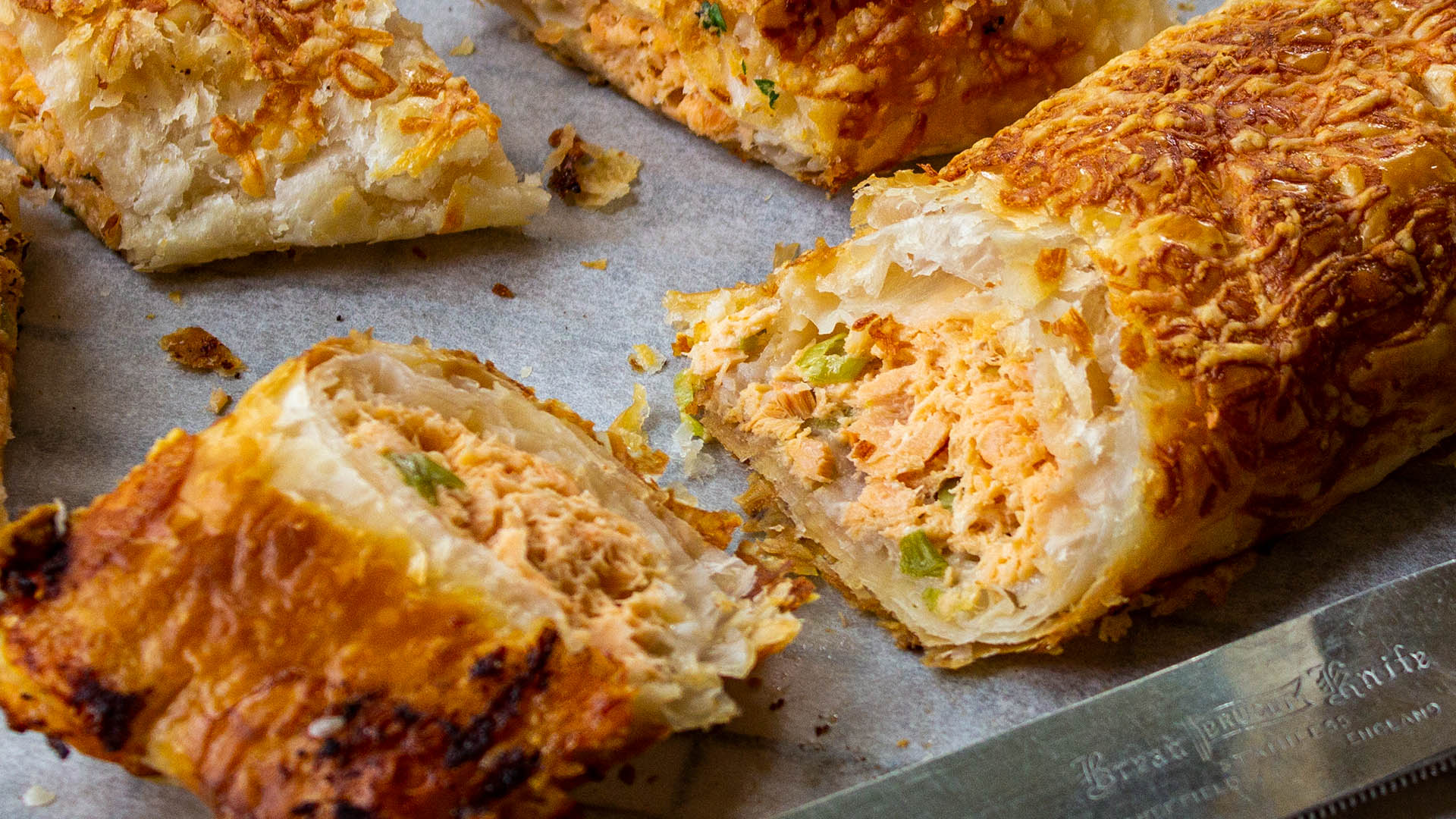 - Place a quarter of the seasoned salmon and cheese mixture in a thick line length ways down the center of each half of pastry sheets. Brush the long edges of the pastry lightly with water or a little of the beaten egg. Fold the half sheets over the salmon filling press the edges together with your fingers to form one long salmon roll. Crimp the edges together firmly with a fork. Repeat with the remaining pastry sheets and salmon mix. Transfer all the rolls onto the lined baking tray, allowing a couple of cm between each one to allow for expansion as they cook. Use a very sharp knife to make decorative cuts diagonally across the top of each roll. Brush with beaten egg and scatter lightly with the remaining grated cheese.