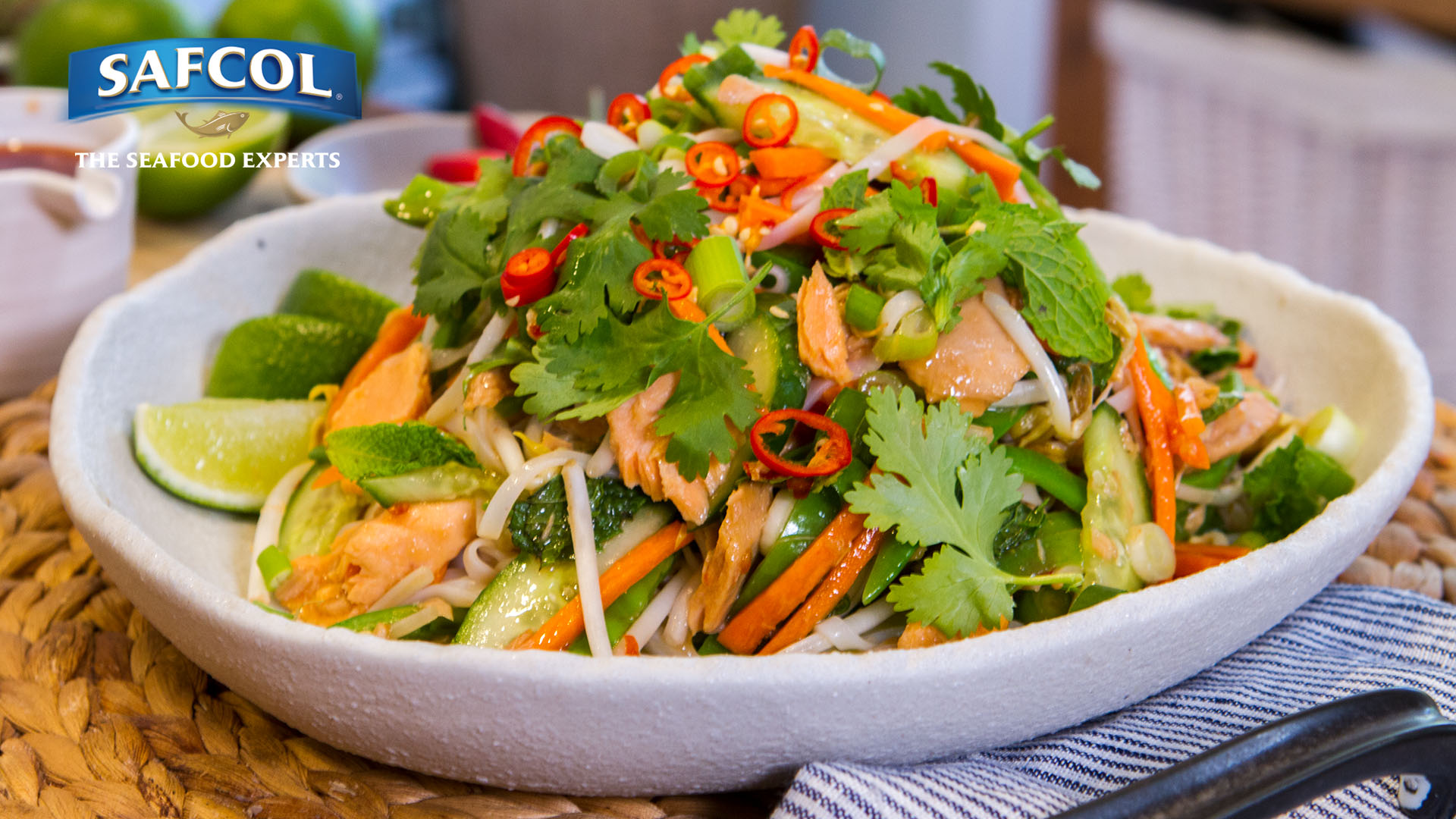 - In a large bowl mix together all the salad ingredients and the drained noodles. Stir through the sweet chilli dressing and the Safcol salmon with soy and ginger including the can juices.