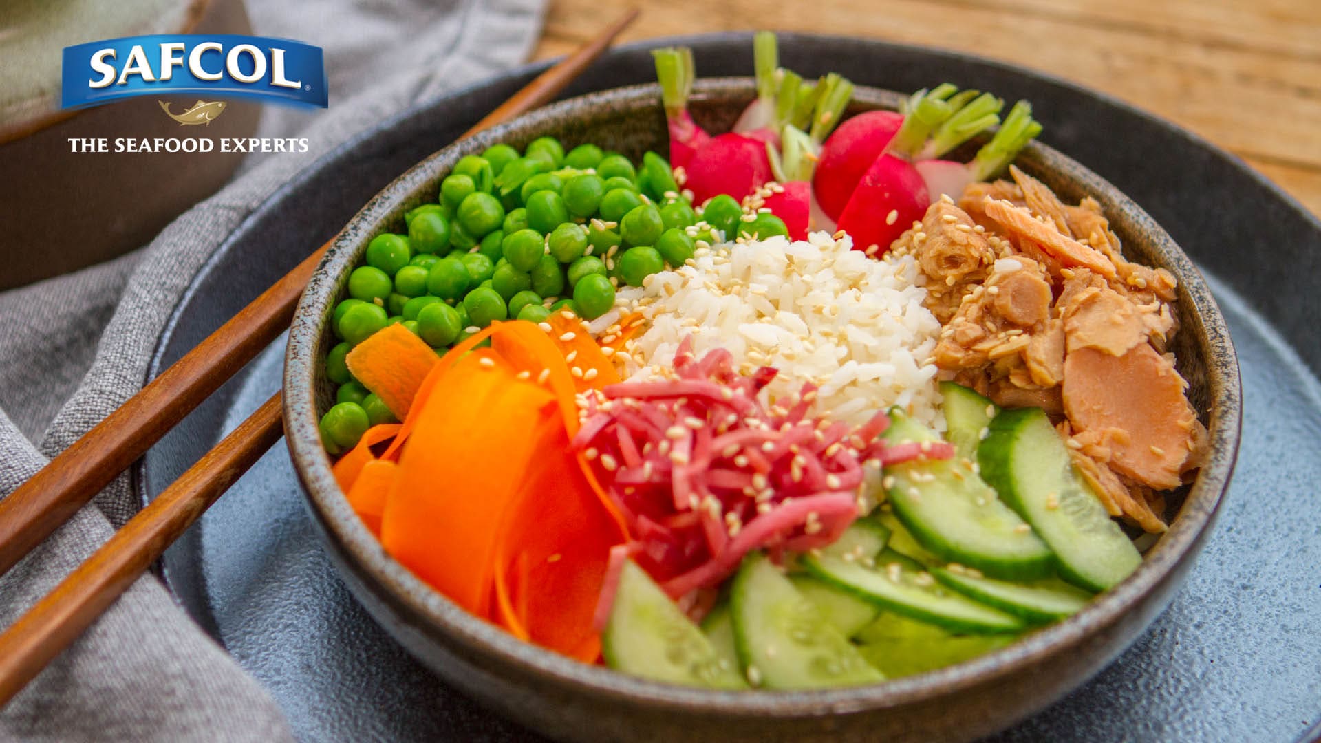 - Place the seasoned rice in the center of a low sided serving bowl or plate and arrange the other ingredients including the Safcol Salmon Soy and Ginger decoratively around the rice.