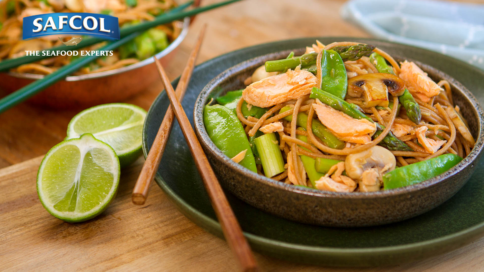 - As soon as the veggies turn bright green, stir through the hot cooked noodles and salmon, finish with the lime juice and sesame oil.