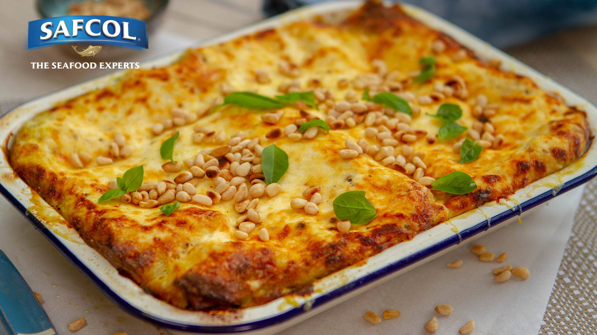 - Sprinkle the lasagna layer with one can of flaked drained salmon and one can of flaked salmon and its liquid. Spoon the pesto evenly over the salmon and top with a even layer of spinach leaves (you need to untangle the spinach to do this, but its very easy to do).