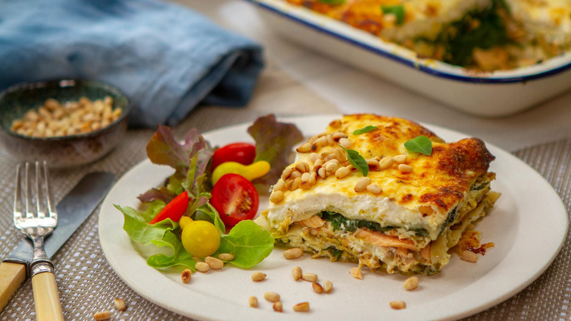 Does creamy ricotta, tasty salmon, pasta and fresh spinach sound good for dinner? Then this salmon pesto ricotta lasagna will really hit the spot, with all those great flavours and the extra flavour hit of basil pesto. Hot and perfect for a warming meal anytime.