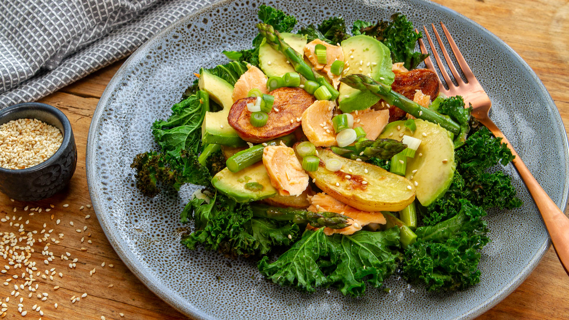 Why would you choose a regular potato salad when you could level up to a Safcol Salmon, roasted kale, avocado potato salad? The staple of the potato salad must be the potato which is a great vegetable to include in your diet because of its fibre content to help keep you feeling fuller for longer. Also, folate to help your body make and repair DNA and potassium for optimal blood pressure levels.