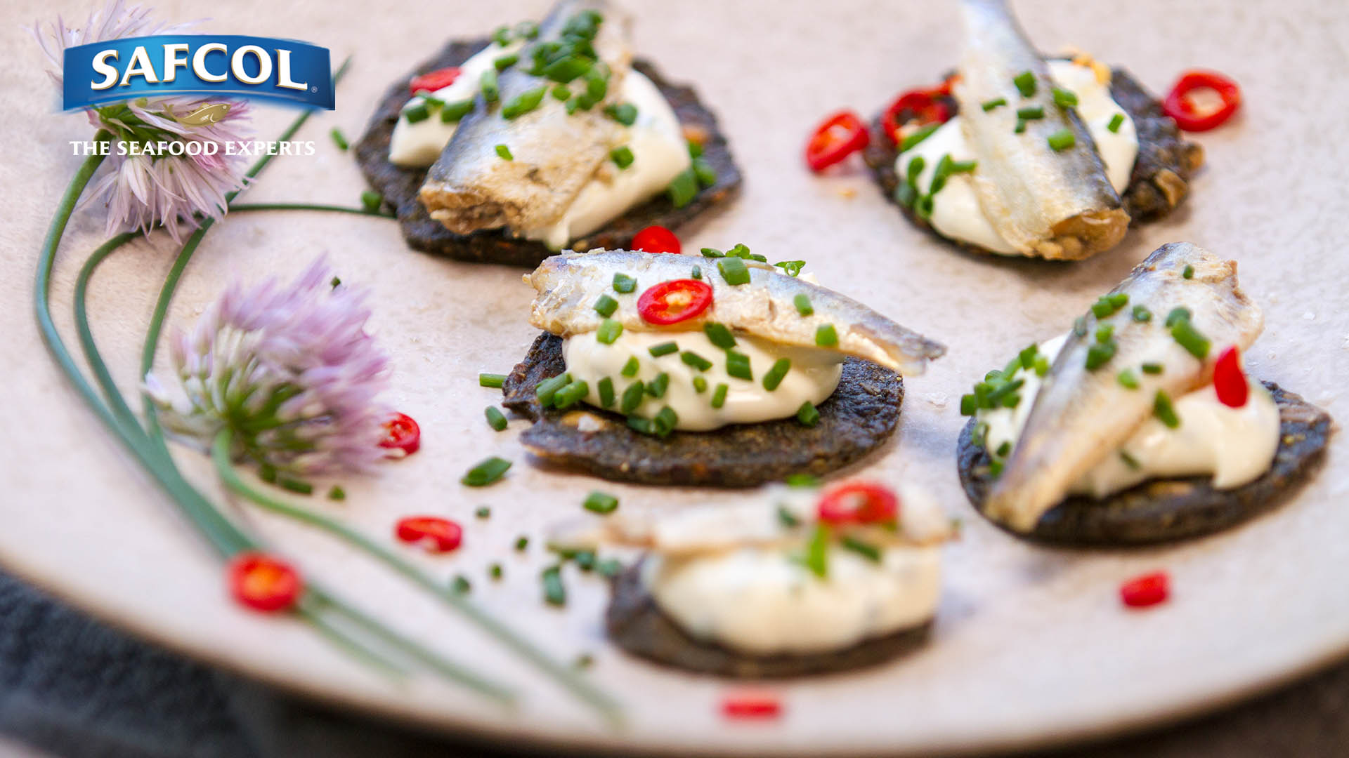- Top each one with half a sardine. Then scatter each biscuit with some of the left over chopped chives and a couple of slices of chilli.