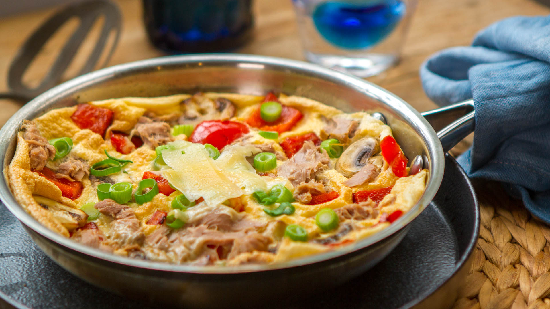 - Scatter the top of the omelette with chunk of drained tuna, the cooked mushrooms and capsicum and a scatter of spring onion and finally a few shavings of parmesan.