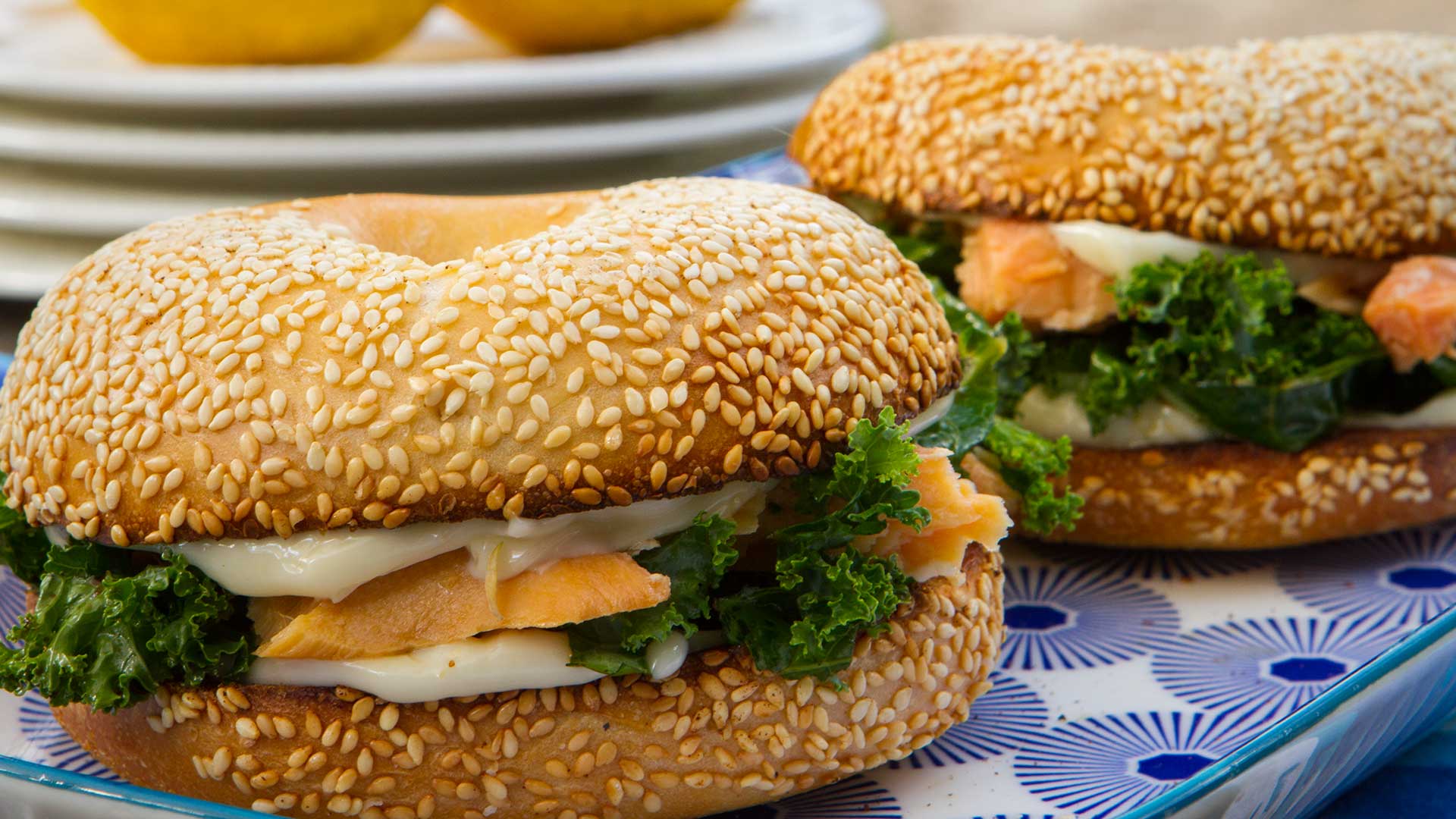 - Pile the marinated kale and smoked salmon on to the bottom half and finish with the bagel top.