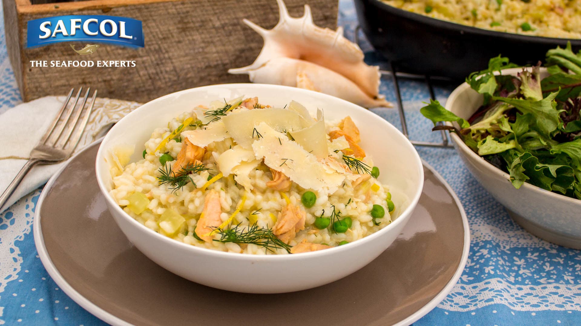 - Reserve a little of the stock. Add the salmon together with the peas, dill, lemon zest and salt and pepper and the remainder of the stock and stir until well combined. Spoon into individual bowls and top with shaved parmesan.