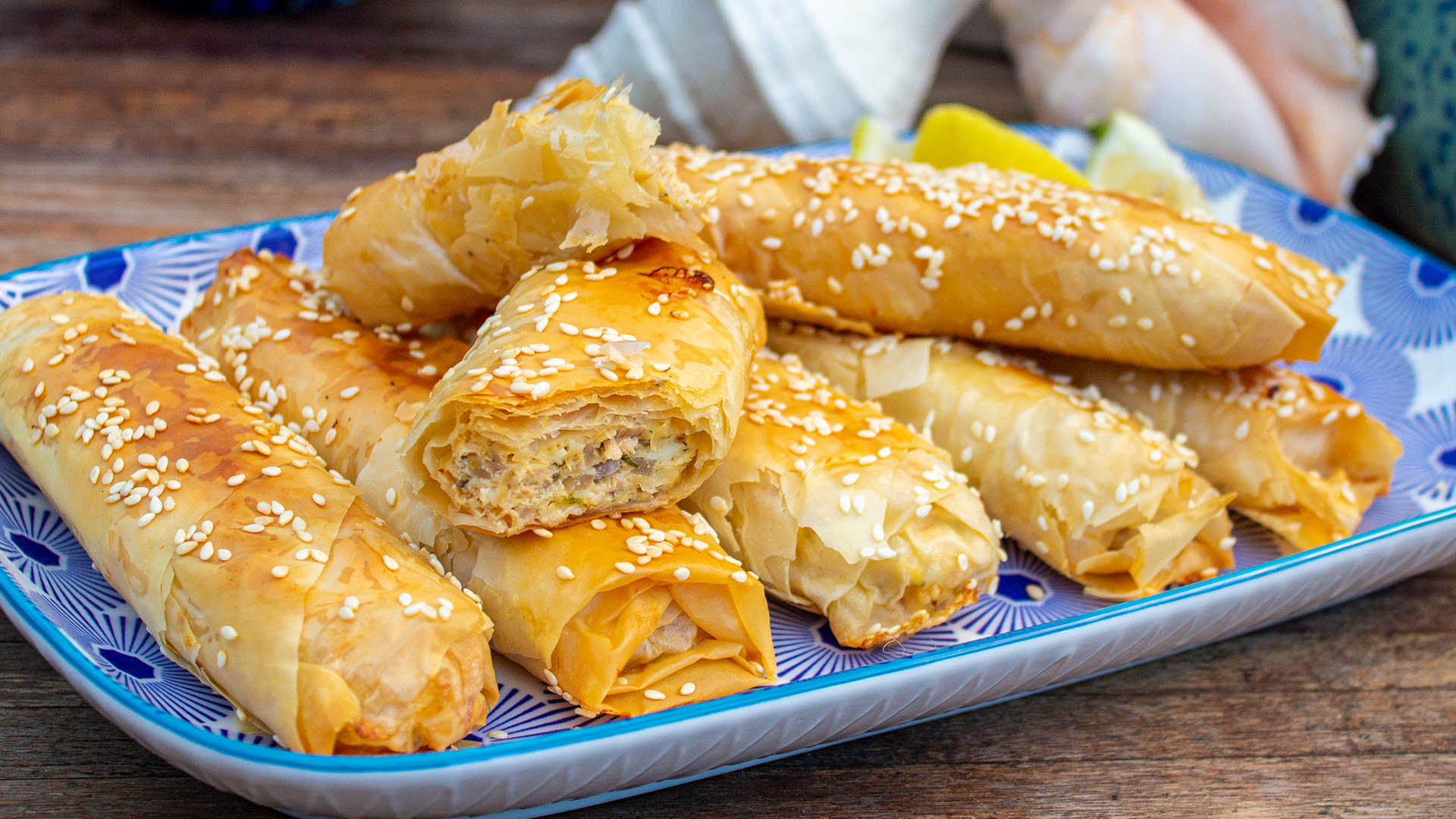 - Lay one layer of filo out and lightly brush with melted butter. Put a large tablespoon of the mix on the bottom corner of the pastry, approximately 5 cm from the edges. Shape into a cigar with your fingers, then roll the pastry diagonally up to the opposite corner, folding in the outside pieces to fit the shape of the filling. Place on a baking tray lined with baking paper. Repeat until all cigars are rolled then brush melted butter over the formed cigars and sprinkle with sesame seeds.