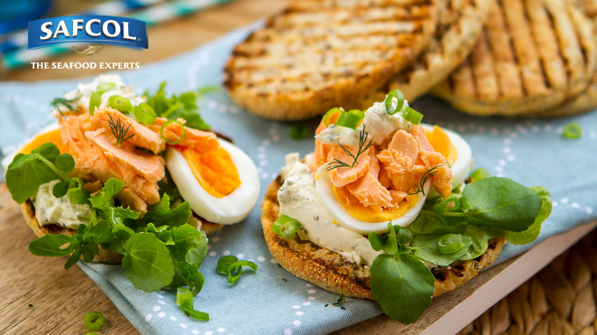 - Spread the dill and lemon cream cheese generously with on the toasted muffins. Top with the rocket leaves, sliced hard boiled egg, and Safcol smoked salmon. Scatter with sliced spring onions.