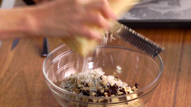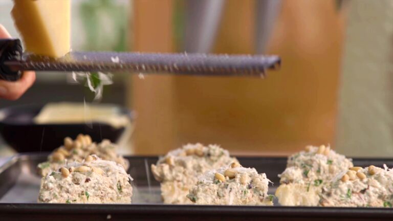 - Place on a baking tray and sprinkle over extra crushed pinenuts and pecorino. Bake for approx 10 minutes until the cheese has melted. Serve warm.