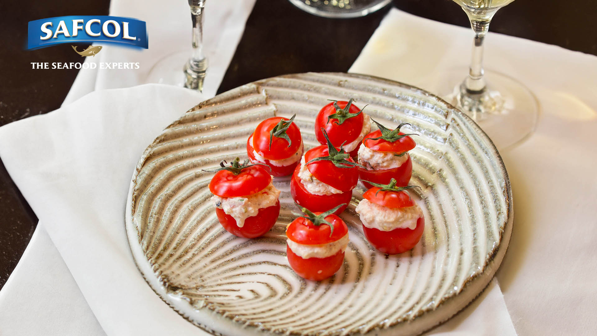- Add half the tin of tuna, cream cheese, Parmesan and finely chopped basil to the bowl with the chopped tomato, use a fork or spoon to mash everything together. Season to taste. Spoon the tuna mixture generously into each hollowed out tomato, place the top back as a lid on at a jaunty angle. Eat immediately or chill and eat within 2-3 hours.