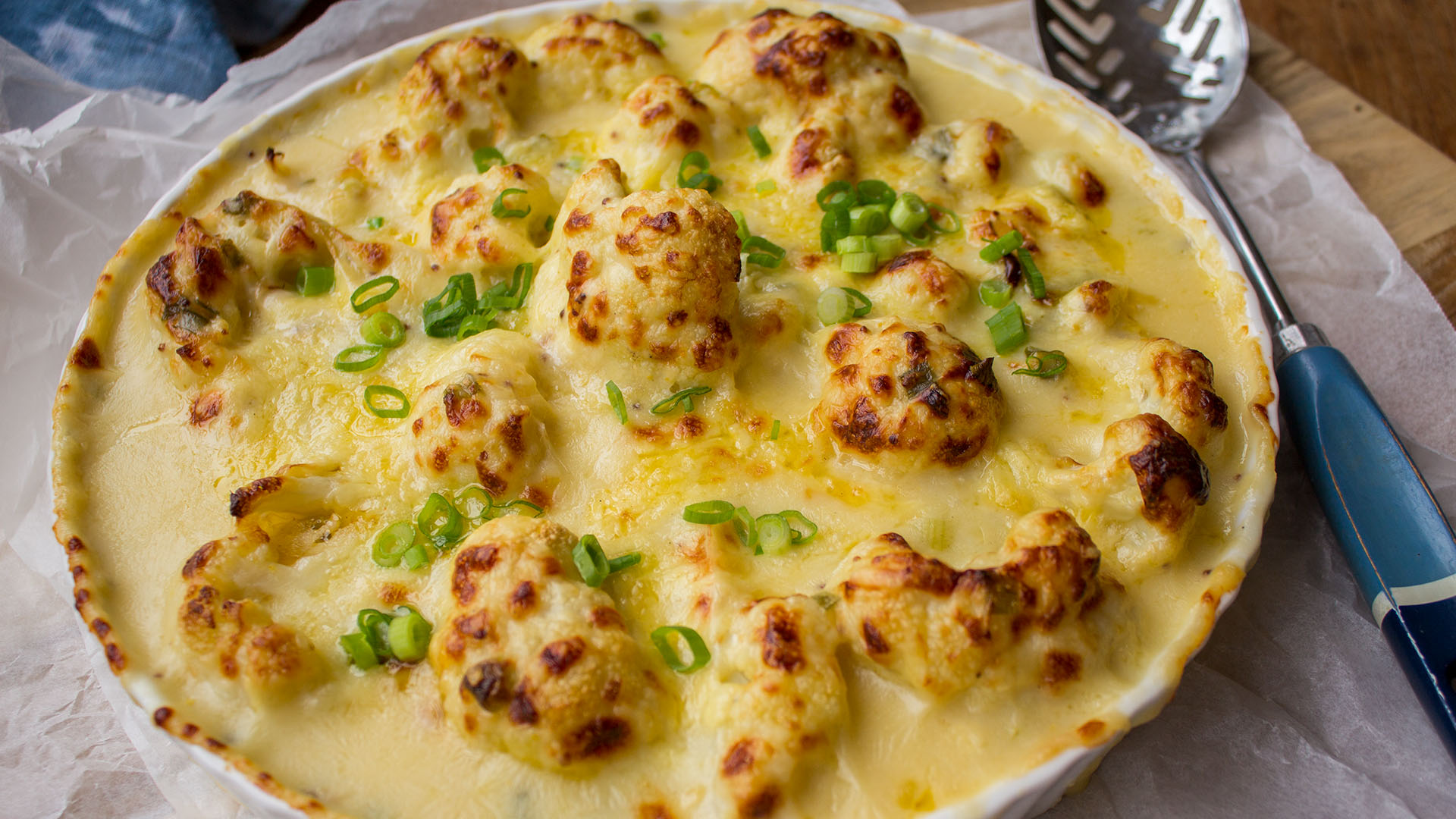 - In a large sauté pan or deep frying pan on a low heat, melt the butter, adding three quarters of the sliced spring onion and cook gently for 1-2 minutes. Sprinkle flour over the butter and spring onions and stir quickly. Slowly pour in the milk and stock stirring continuously, now turn the heat up to medium low and keep stirring until the sauce thickens and starts to bubble. The sauce needs to be quite thick and smooth. Remove from the heat, add 1½ cups of grated cheese and the mustard. Season to taste with salt and pepper and a small dash of Tabasco. Spread the tuna evenly over the base of the quiche dish, then pile the cauliflower florets over the tuna. Top with the sauce and sprinkle the rest of the Cheddar cheese. Then bake for 15-20 minutes until the top turns golden brown. Scatter with the remaining spring onions and serve piping hot, with crusty bread and a green salad.