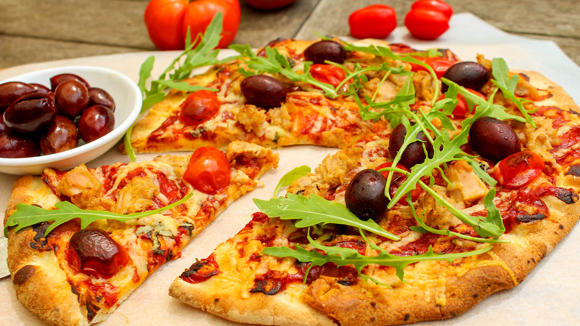 Tuna olive rocket and cherry tomato pizza
