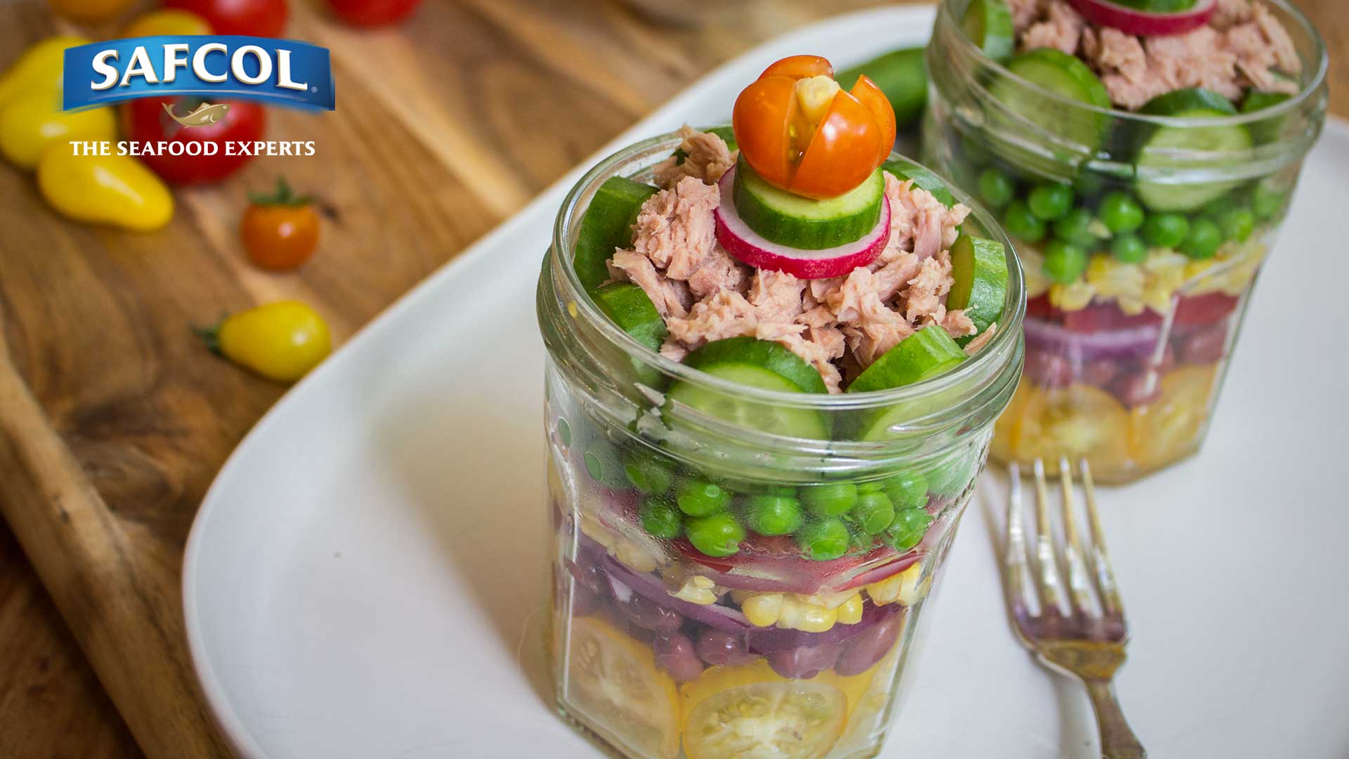 - Using 2 large clean jam jars, layer up the vegetables in whatever order you prefer. Top with flaked Safcol tuna and decorate with cucumber, cherry tomatoes, corn kernels and radishes.