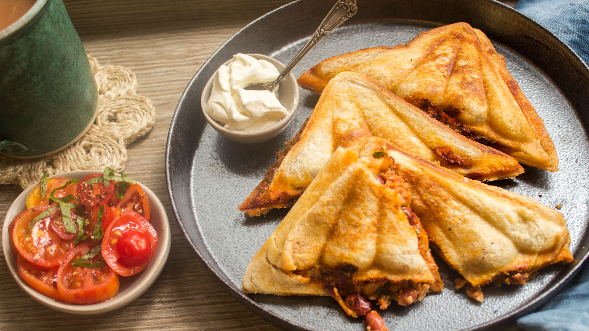 - Place in the Jaffle iron, two at a time, and grill until golden. Serve piping hot with sour cream and maybe a little salad.