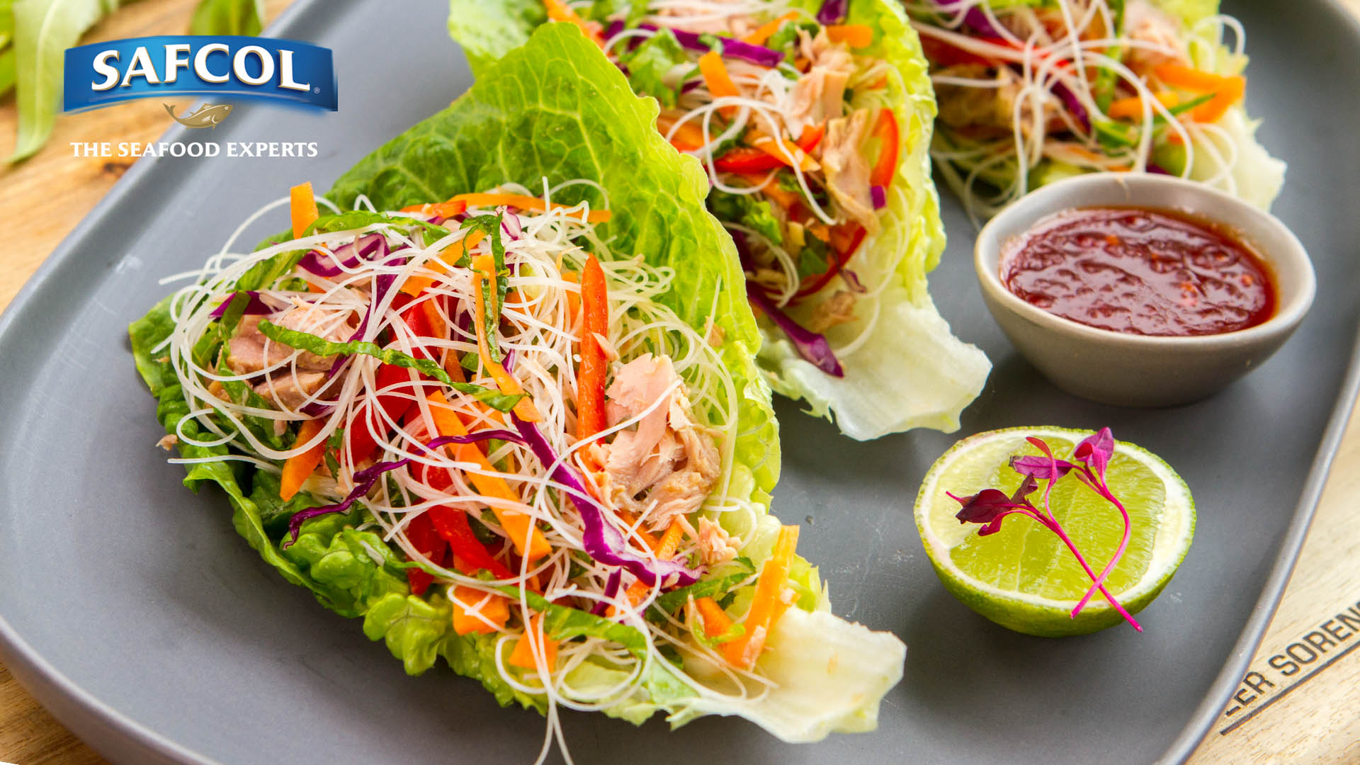 - Divide the tuna vermicelli and veggie mix between the 8 lettuce leaves and arrange on a large serving plate.
