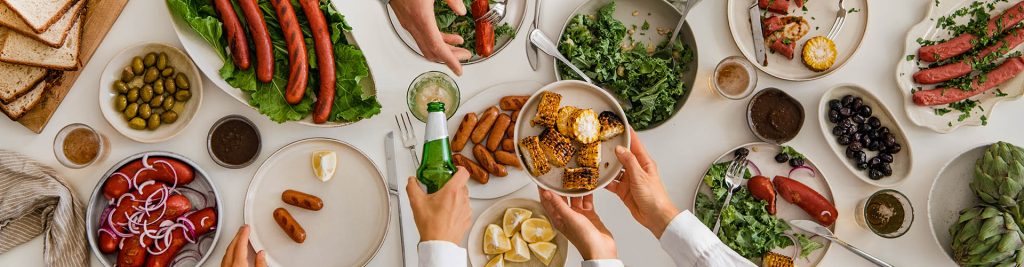 As a starting point, aim to create a balanced meal. Use a healthy plate model; fill one-quarter of the plate with whole grains, the second quarter with lean protein, and the remaining half is filled with fresh produce like fruit or vegetables. Also included in a healthy plate is a small amount (around 7-14g) of a healthy fat source, like extra virgin olive oil.